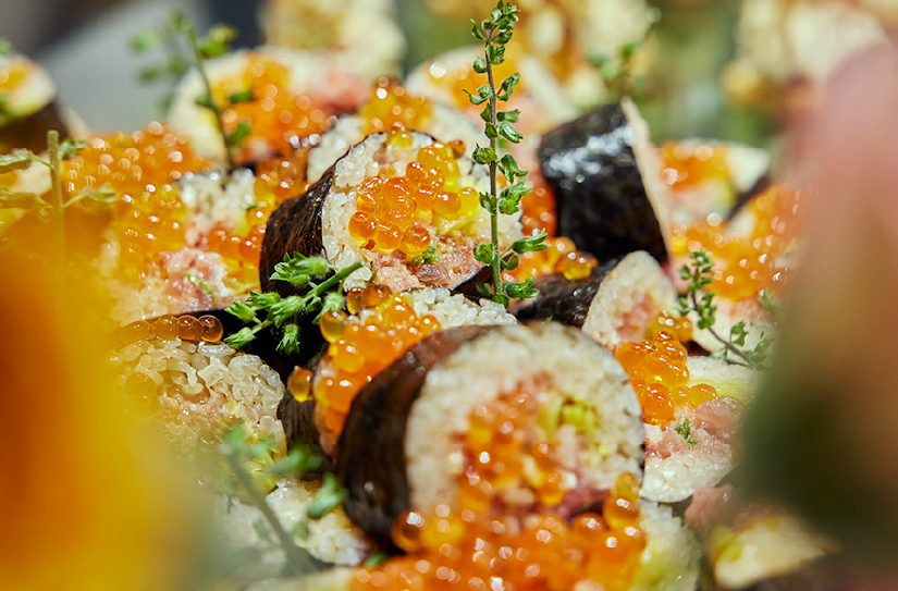 OTAで使うすべての魚介は市場で仕入れた新鮮・旬素材のみ。 中でも、OTAのおすすめは、寿司職人がつくる本気の手巻き寿司“OTA巻き”と見た目にも華やかな“OTA押し”です。